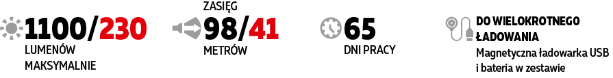 CECHY MULTI-LATARKI Z DODATKOWYM CZERWONYM ŚWIATŁEMCztery diody LED: oszałamiające czerwone światło do 230 lumenów i białe światło do 1100 lumenów dzięki 2 diodom LED na każdy kolor. Czerwone światło jest niewidoczne dla zwierząt, ryb i owadów, wygodne dla widzenia w nocy. 5 trybów jasności dla każdego koloru, prosta obsługa jednym przyciskiem i podwójne kliknięcie, aby przełączać między światłem białym i czerwonym. CO NOWEGO W WIZARD C2 WRNowy układ optyczny i obiektyw TIR: przepuszcza więcej lumenów, zapewnia większy zasięg wiązki przy wygodnym szerokim oświetleniu. Maksymalna wydajność diody: osiągnęliśmy 1100 lumenów zamiast 1000 lumenów w Wizard WR. Nowa konstrukcja głowicy: lepsze odprowadzanie ciepła i jaśniejsze światło z większą liczbą lumenów. Powiększony przycisk boczny: naciskanie jest delikatniejsze i wygodniejsze. Unowocześniona elektronika i oprogramowanie układowe: wydłużony czas pracy i zwiększona jasność. Łatwa obsługa jednym przyciskiem: podwójne kliknięcie przełącza pomiędzy światłem białym i czerwonym, naciśnięcie i przytrzymanie powoduje przełączanie pomiędzy trybami wybranego światła. Ulepszone sprężyny: zastosowanie nowych sprężyn w celu lepszej ochrony akumulatora i sterownika oraz zwiększenia wydajności operacyjnej. Stylowa obudowa: matowe anodowanie, elegancki design, branding w nowym stylu korporacyjnym. Nowa magnetyczna ładowarka: latarka ładuje się 2 razy szybciej (3 godz 20 min). ZALETY LATAREK Z SERII WIZARD
